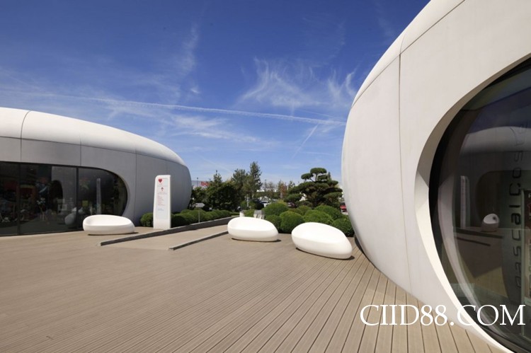 由四条走廊隔开的四部分建筑体量如同四个巨大的门廊耸立在地面上。建筑外部覆盖着白色的穿孔背光铝网。商店如环状珊瑚礁一般排列,形成一种动态的布局,而停车场则融入了花园。