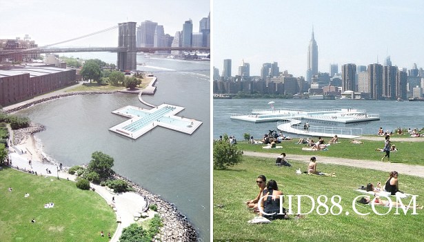【环球网综合报道】纽约市的夏天历年来都酷热难忍,然而近期将有所改观。据英国《每日邮报》5月13日消息,由华裔建筑师黄东平(Dong-Ping Wong)率领的一支建筑师团队正在着手打造一个漂流水池。该水池位于纽约市东河的正中央,呈加号状,预计明年夏天对市民开放。