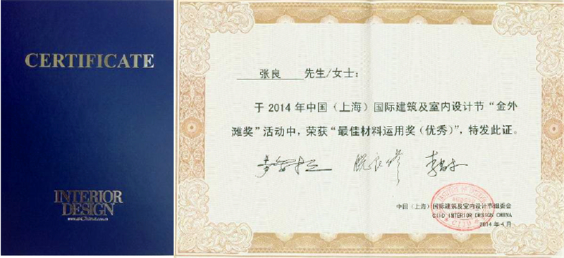 •2014中国(上海)国际建筑及室内设计节“金外滩奖”- 最佳材料运用奖•中国建筑装饰协会注册室内建筑师。