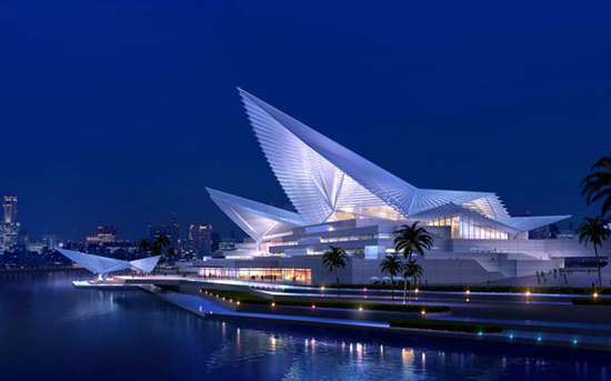 该方案由程泰宁院士原创设计,构思不拘泥于具体的形象,而是对湛江的历史文化、地理气候、风土民情、自然环境的提炼与升华。设计从大环境出发,造型独具匠心,屋顶如叶似帆,如伞似扇,从海边宛如层岩的基座上蓬勃而出,又如鲲鹏振翅,一飞冲天。建筑形式明快而不失沉稳,精致而不失大气,典雅而不乏豪迈,五大功能排列组合,形成连绵起伏、错落有致的以文化艺术为主题的生态滨海公园,文化中心与整体环境共同营造出闻涛起舞、舞动南海的意境。