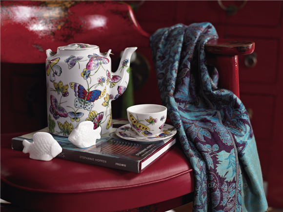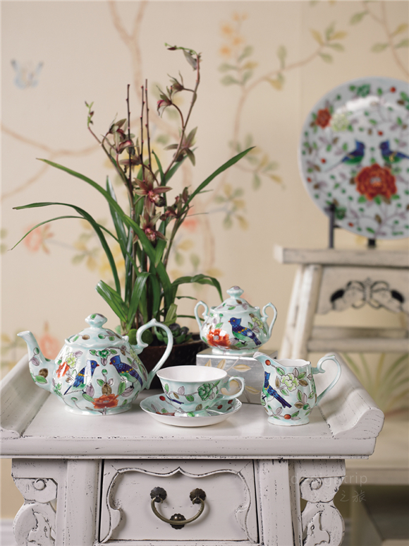 陈列手法上,最常用的就是艺术设计中最简单的布局手法——点线面。本案例中三个杯子是三个点,底下一片树叶代表线,托盘可以算作面,同样的要素,不同的摆设方法,视觉效果截然不同。