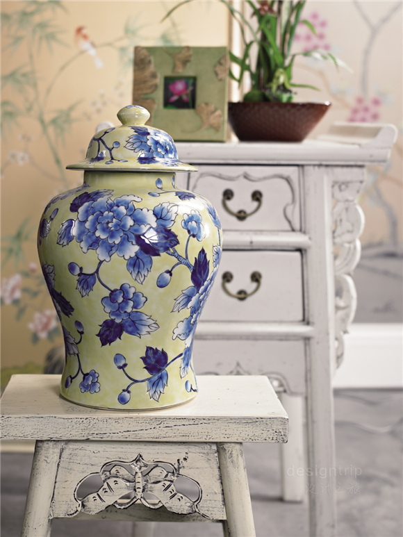 重复陈设式为同一个元素用不同的材质去表达,以达到统一、和谐的视觉效果。本案例中,青花瓷元素在挂画中出现,又在床品、抱枕上重复出现,这是运用了重复陈设的手法,重复的概念听起来容易,但执行起来很难。